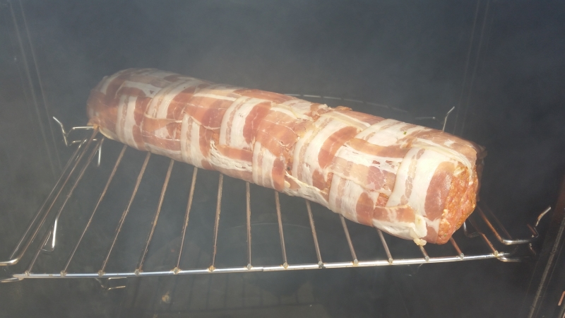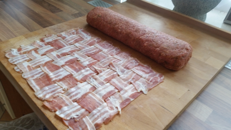 Die Hackfleisch-Rolle aus der Frischhaltefolie befreien und in den Bacon einrollen.