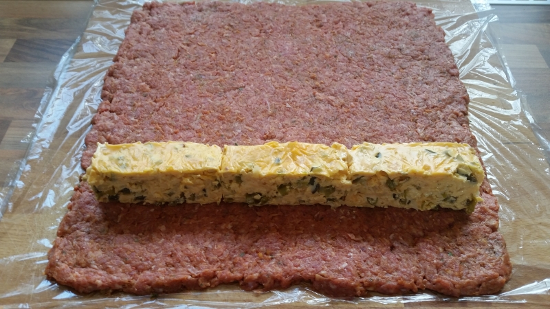 In der Frischhaltefolie kann man die Hackfleisch-Rolle sehr flexibel noch in der Länge anpassen, falls das Bacon-Netz eine andere Breite hat.