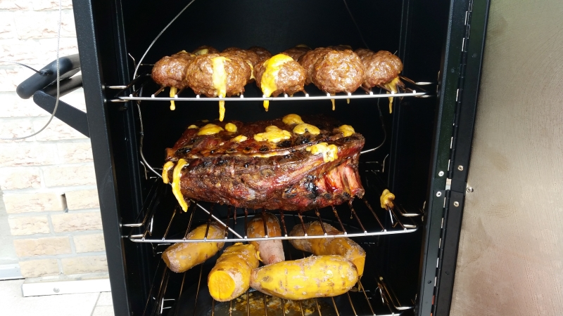Moink-Balls auf Schweinenacken auf Süsskartoffeln. Läuft.