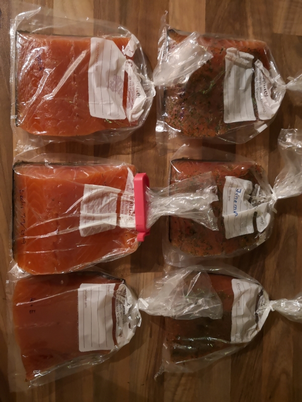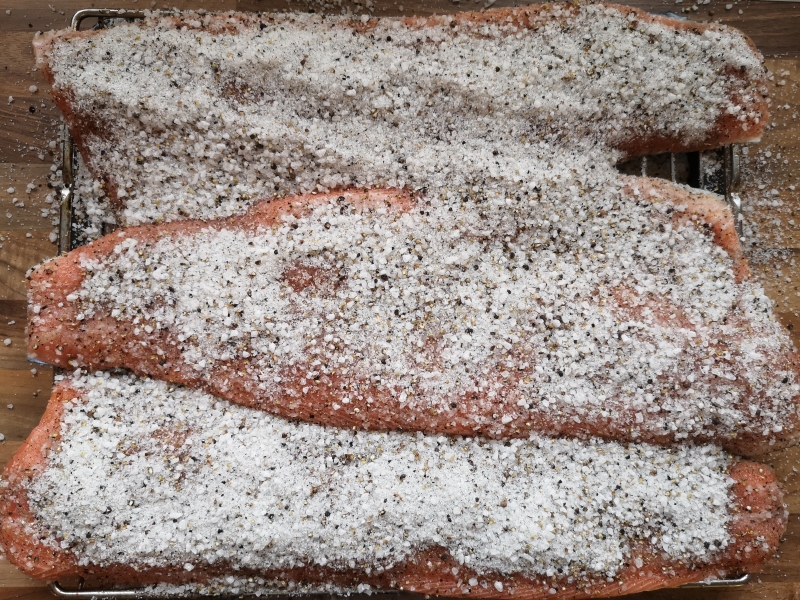 Die Salz-Zuckermischung wird anschließend vollständig vom Lachsfilet abgewaschen (vorher evtl. Teigschaber benutzen) und der Fisch trocken getupft. Anschließend wird er mit Whisky, Gin oder anderem hochprozentigem Alkohol eingepinselt. Der Lachs geht dann nochmal ohne Abdeckung für 24 Stunden in den Kühlschrank zum Abtrocknen.