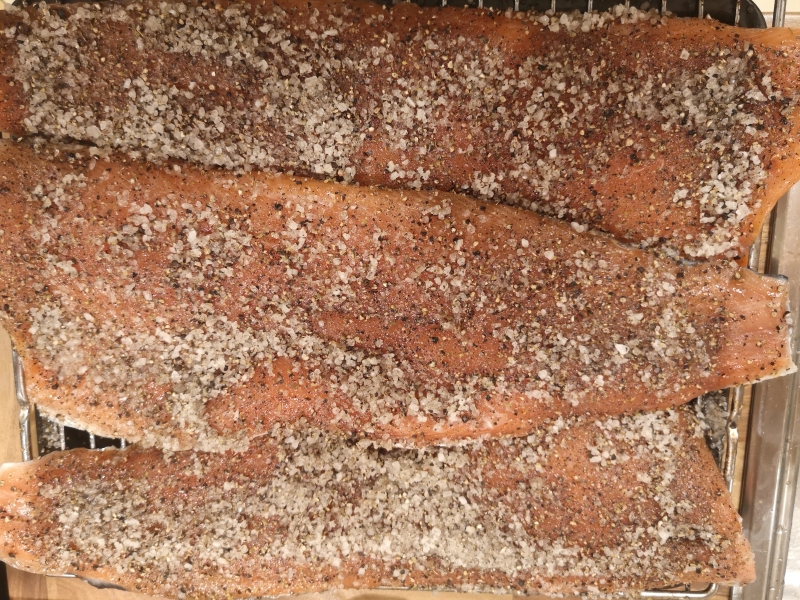 Insg. sollte der Lachs 3 Tage im Kühlschrank ohne Abdeckung getrocknet werden (nach dem Beizen, zwischen den Räuchergängen, nach dem Räuchern). Durch das Trocknen reduziert sich das Volumen des Lachs, er wird deutlich fester und aromatischer. Damit ist er um Klassen besser als jeder Supermarkt-Lachs.