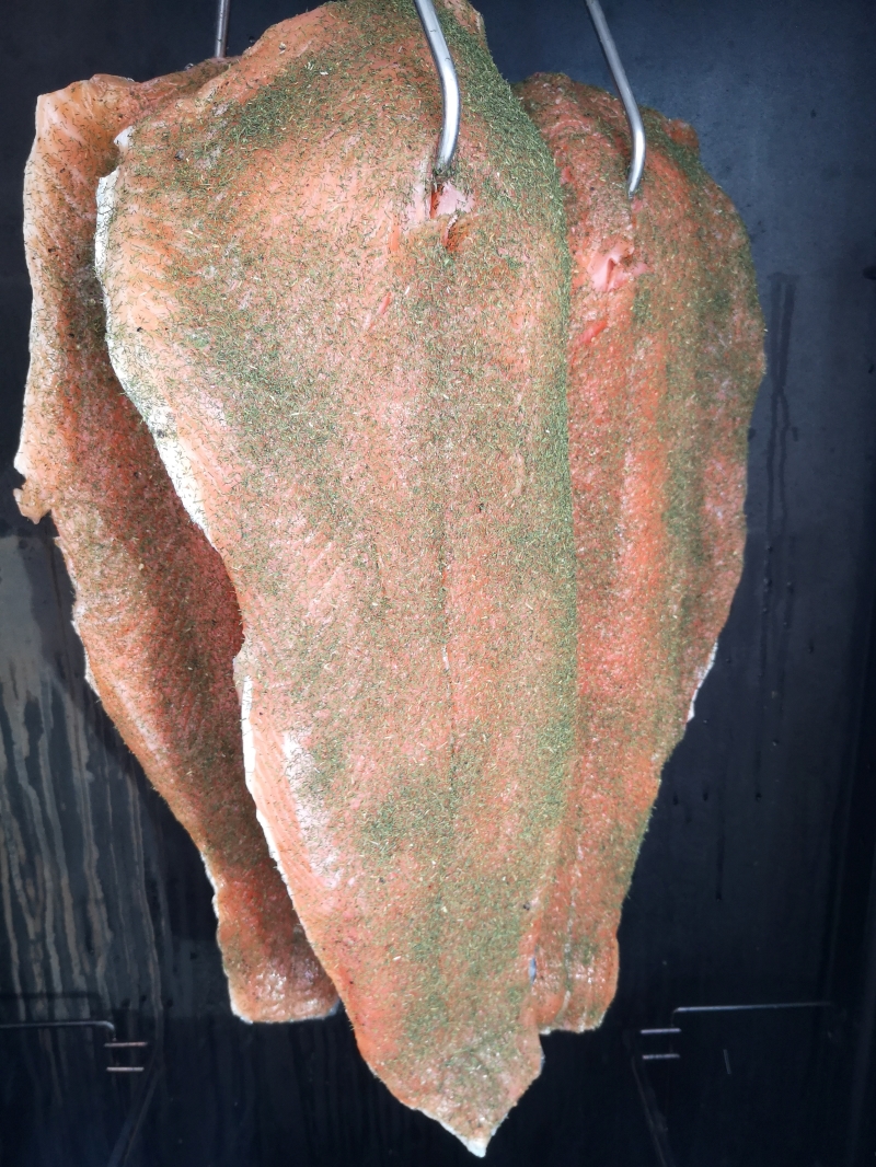 Nach Belieben z.B. mit Dill würzen. Mit Hilfe eines Kaltrauchgenerators bzw. einer Räucherschnecke wird der Lachs bei Temperaturen zwischen 0-25 °C geräuchert. 2 bis 3 Räucherdurchgänge mit jeweils 6 Stunden sorgen für intensiven Rauchgeschmack. Zwischen dem Räuchern sollte man mind. 6 Stunden Pause machen.