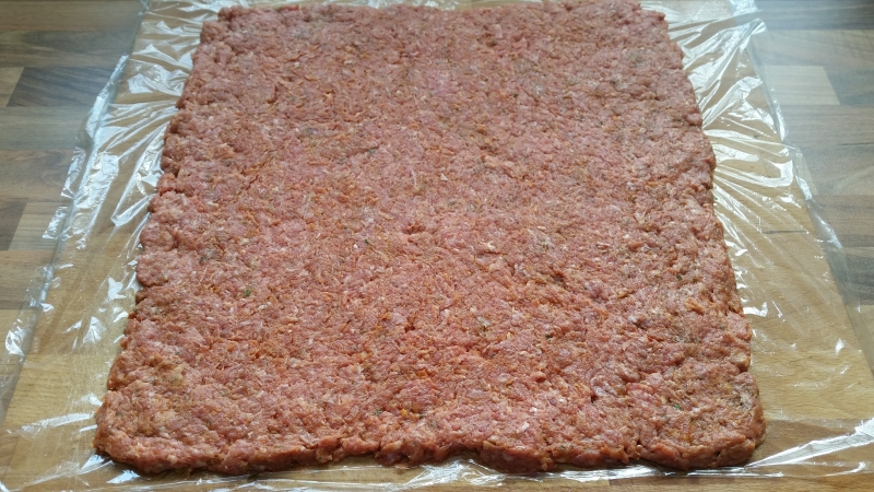 Hackfleisch auf Frischhaltefolie mit dem Nudelholz ausrollen.