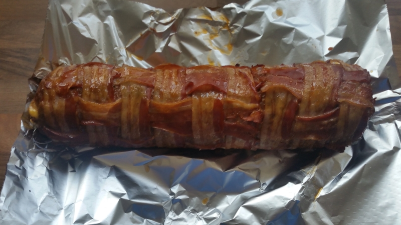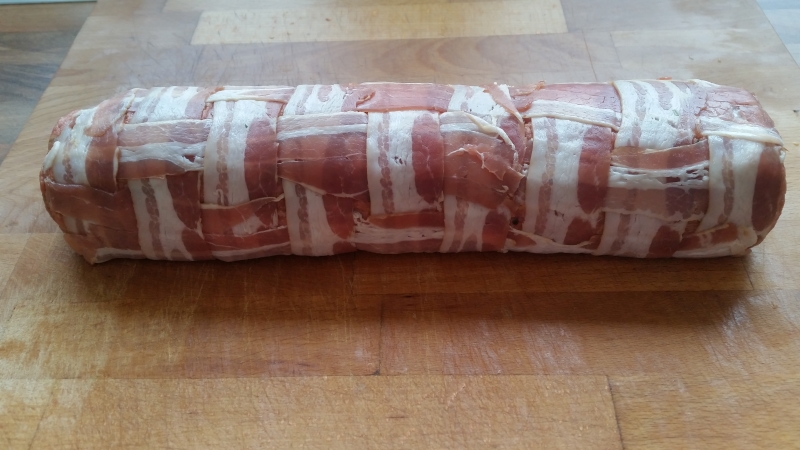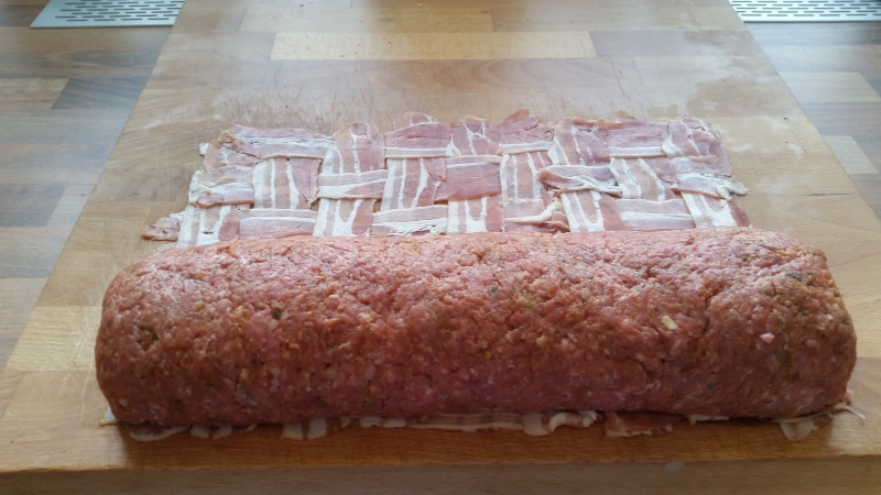 Die Hackfleisch-Rolle aus der Frischhaltefolie befreien und in den Bacon einrollen.