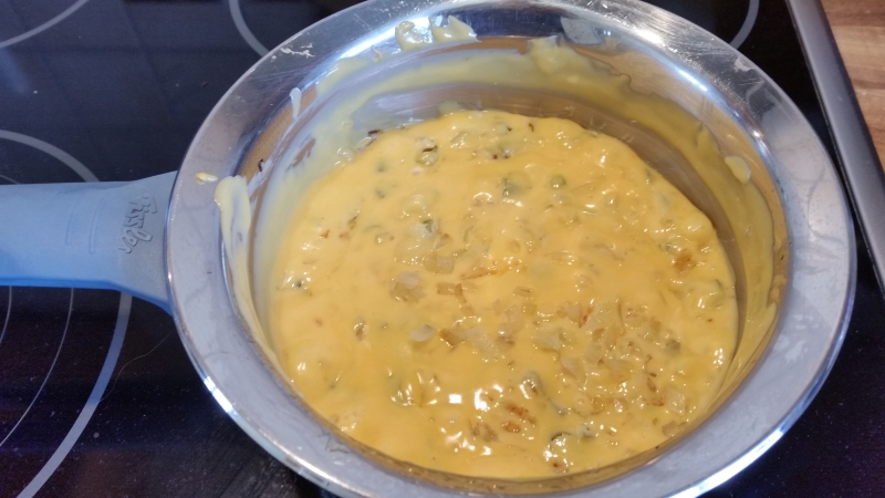 Zwiebeln und Jalapenos zum geschmolzenen Käse geben und verrühren.