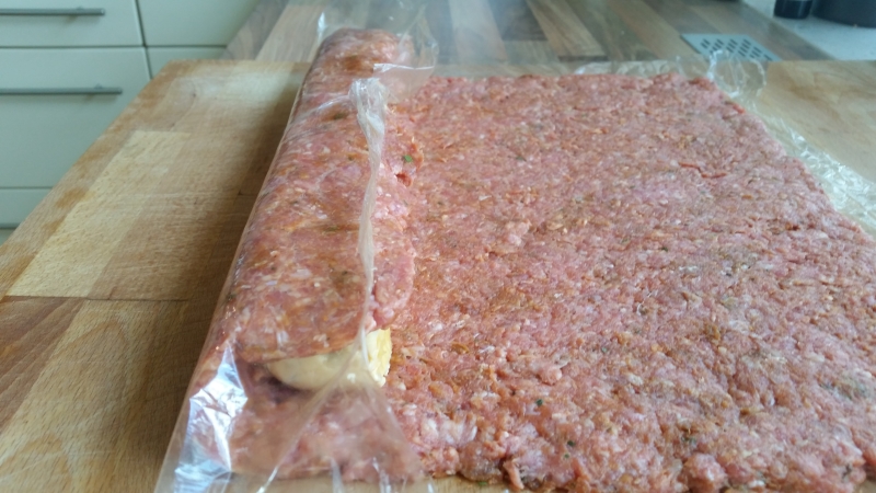In der Frischhaltefolie kann man die Hackfleisch-Rolle sehr flexibel noch in der Länge anpassen, falls das Bacon-Netz eine andere Breite hat.