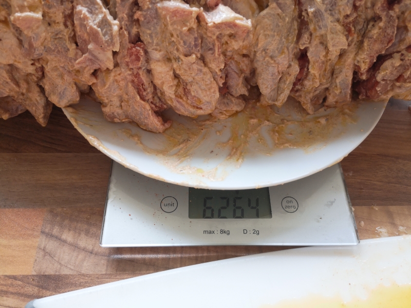 Die Zutaten der Marinade miteinander verrühren und das Fleisch über Nacht einlegen.