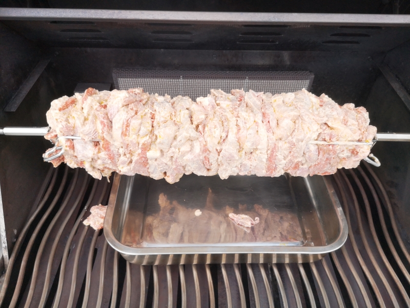 Dabei versuchen, die Oberfläche des Fleisches möglichst glatt zu ziehen. Dadurch kann man das gegarte Fleisch später besser vom Spieß abschneiden.