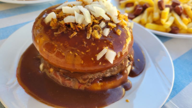 Bøfsandwich med brun sovs.