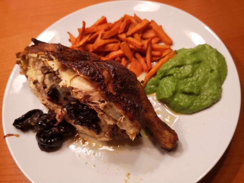 Gummiadler mit Backpflaumenfüllung, Süsskartoffelpommes und Erbsenpüree.