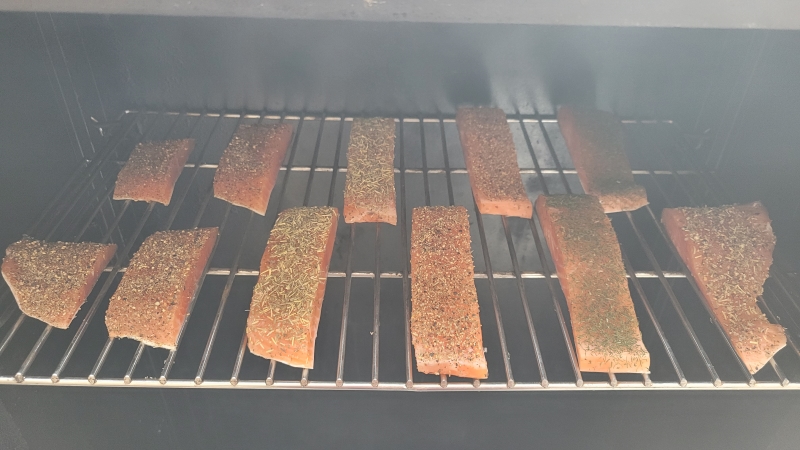 Im Räucherschrank wird der Lachs bei 90 °C geräuchert bis zu einer Kerntemperatur von 60 °C.